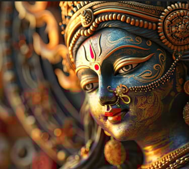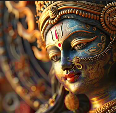 Known as the Dark Mother, she is often depicted with a fearsome appearance (dark skin, skull garland, disheveled hair) - representing fierce maternal love and spiritual transformation, she helps devotees destroy ego and illusions for growth.